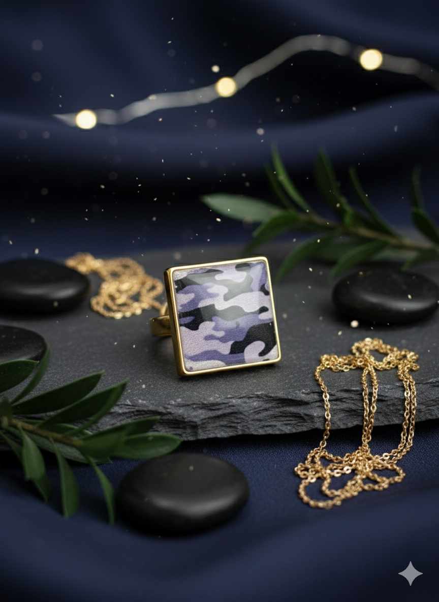 Este anillo ajustable de camuflaje combina arcilla polimérica, resina y acero inoxidable, ofreciendo una pieza durable y con estilo. Su diseño adaptable garantiza un ajuste cómodo para diferentes tamaños, mientras que los materiales aseguran resistencia al desgaste y un acabado distintivo. Ideal para quienes buscan un accesorio único y funcional con un toque moderno.