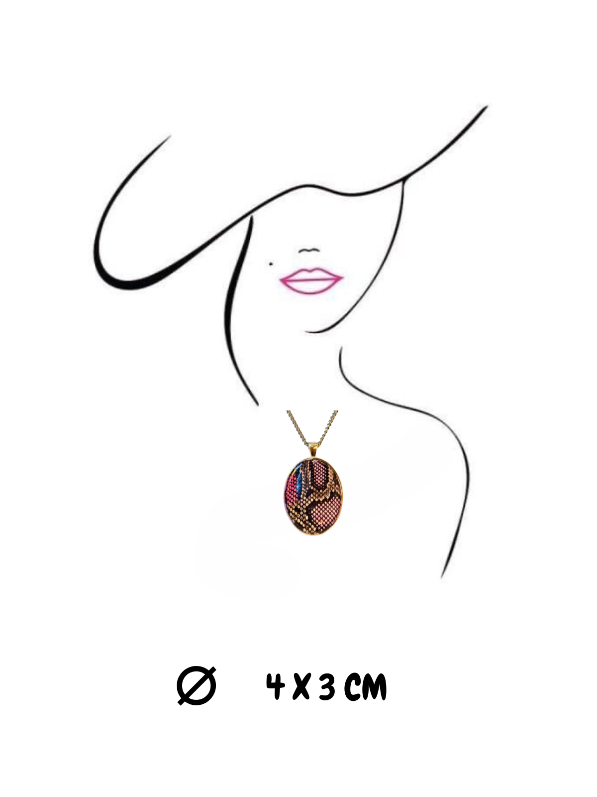 Este colgante ovalado con diseño de piel de serpiente combina un medallón elaborado en arcilla polimérica y resina con una resistente cadena de acero inoxidable. Su acabado detallado aporta un toque elegante y moderno, ideal para quienes buscan una joya única y duradera. Se entrega en una elegante caja negra de joyería, perfecta para regalar o conservar con estilo.