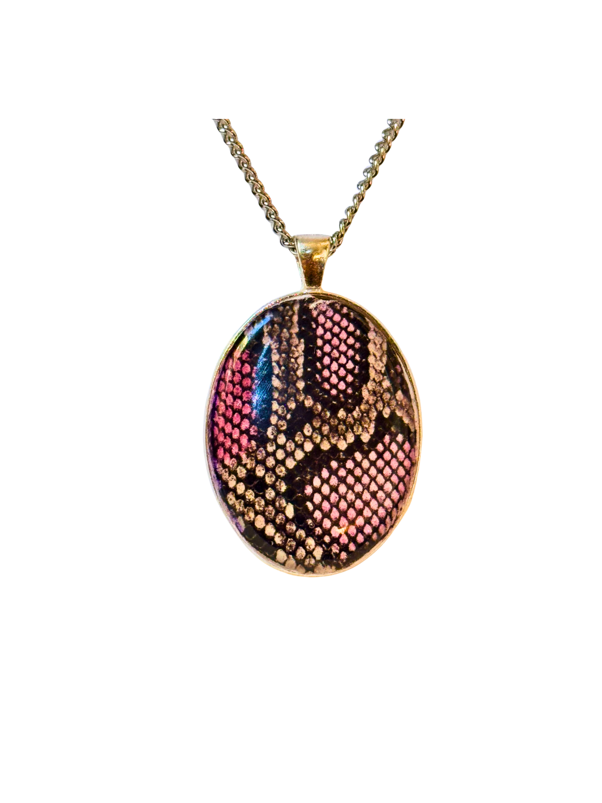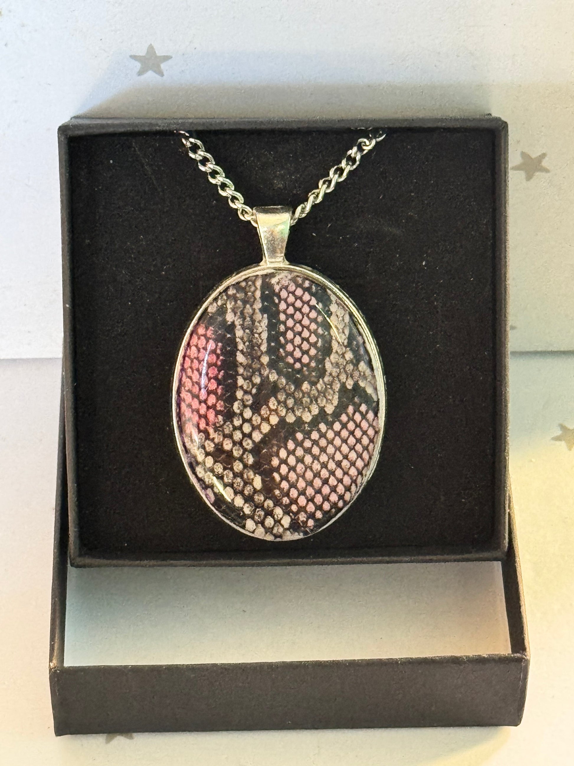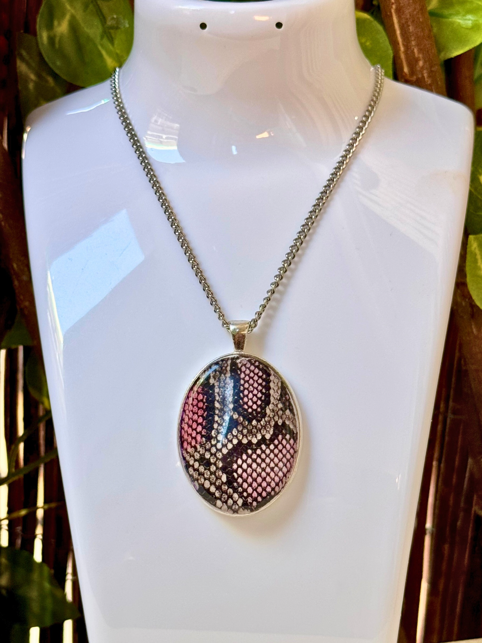 Colgante Ovalo Piel de Serpiente.Medallón y cadena de acero inoxidable. Hecho en arcilla polimérica y resina.Se envía en cajita de joyeria negra