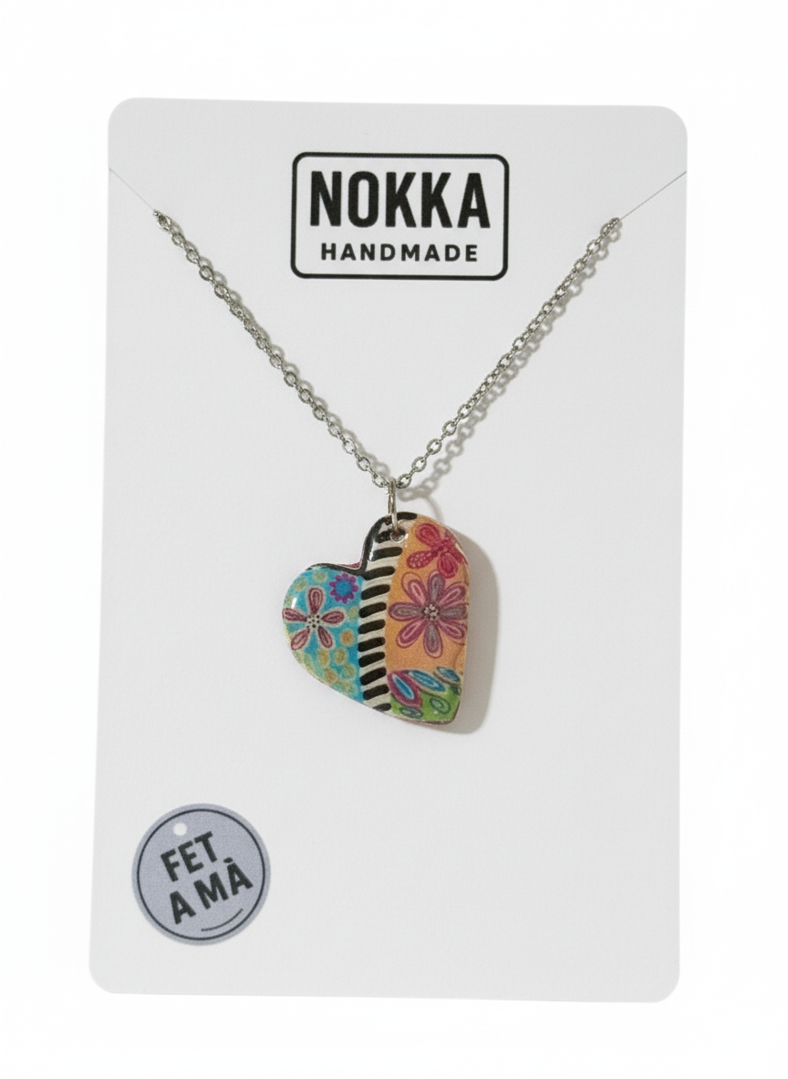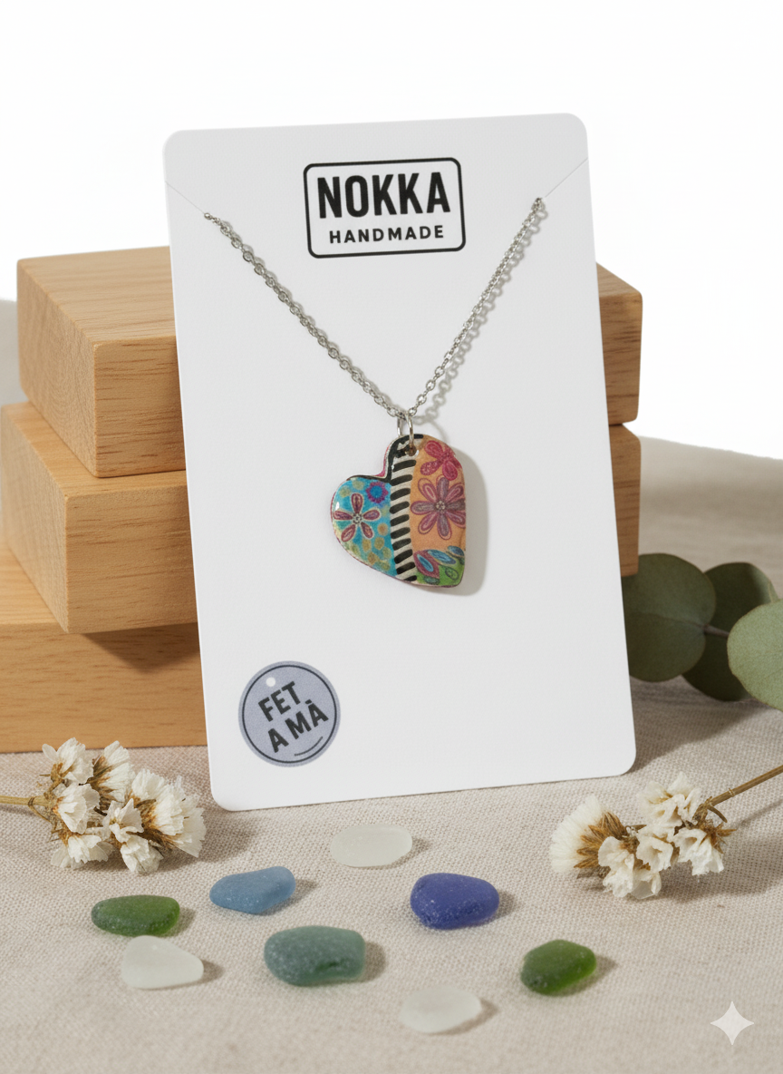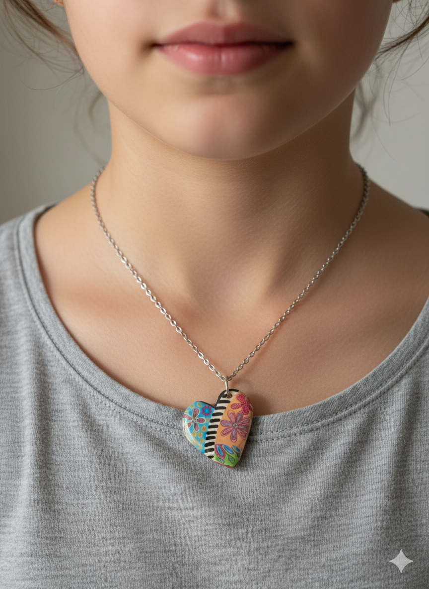 Este colgante de corazón estampado combina la delicadeza de la arcilla polimérica con la resistencia de la resina, ofreciendo una pieza ligera y duradera. Su cadena de acero inoxidable garantiza larga vida y resistencia a la corrosión, ideal para uso diario. Perfecto para quienes buscan un accesorio elegante con diseño cuidado y materiales confiables.