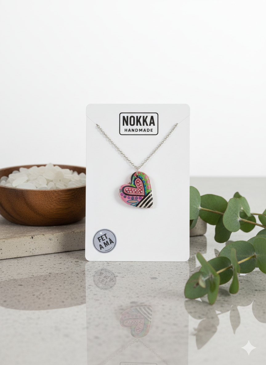 Este colgante corazón estampado combina arcilla polimérica y resina para ofrecer un diseño resistente y detallado. Su cadena de acero inoxidable garantiza durabilidad y resistencia a la corrosión, perfecto para uso diario. Un accesorio elegante que aporta un toque distintivo y sofisticado a cualquier estilo.