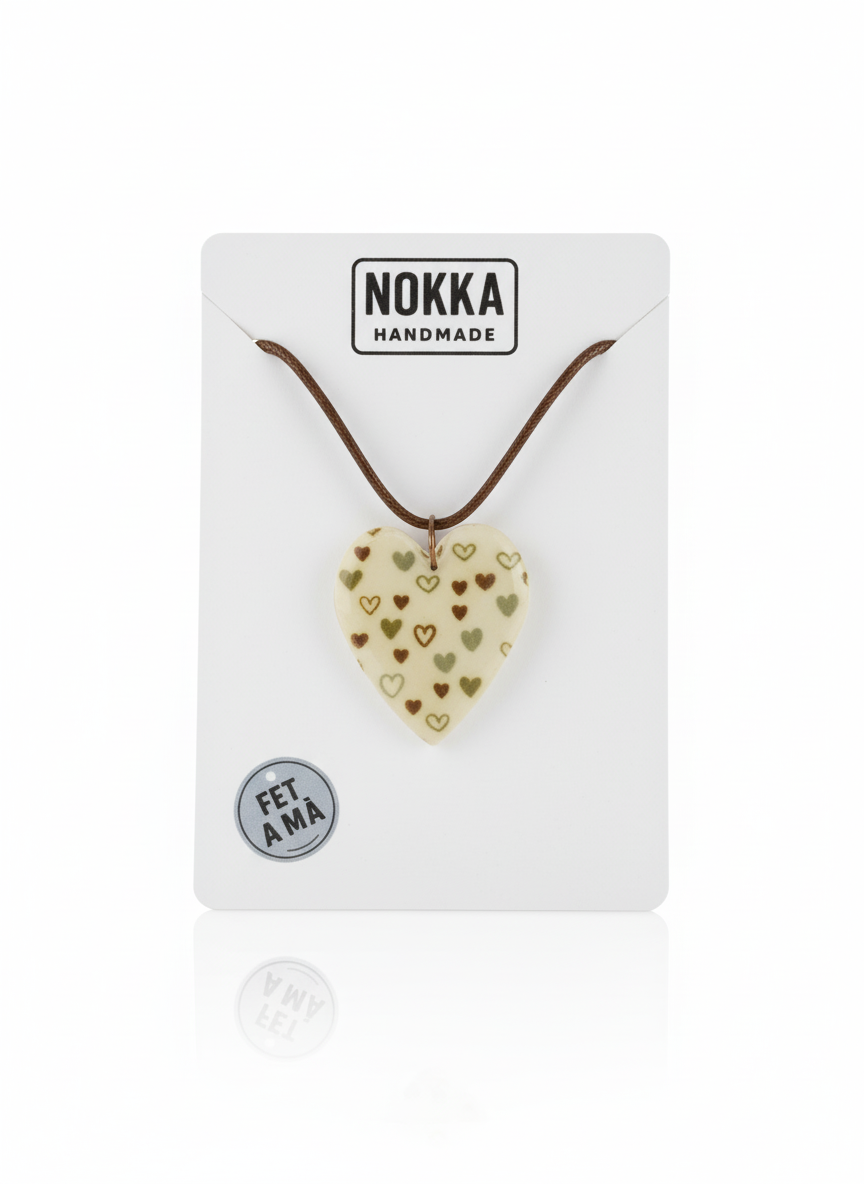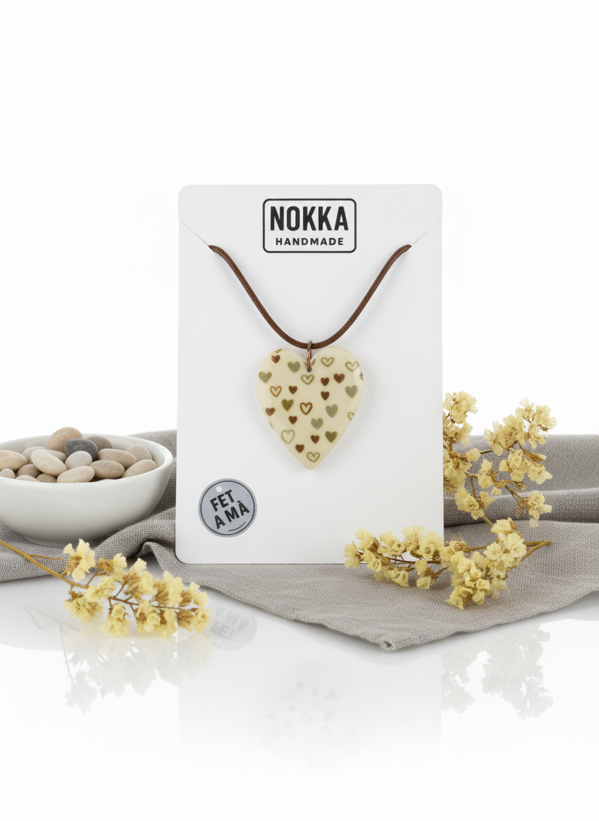 Este colgante de corazón estampado está elaborado cuidadosamente con arcilla polimérica y resina, materiales que garantizan durabilidad y un acabado detallado. Incluye un cordón resistente con cierre de acero inoxidable, que aporta seguridad y comodidad para su uso diario. Su diseño combina originalidad con resistencia, ideal para quienes buscan una pieza elegante y fiable en su colección de accesorios.
