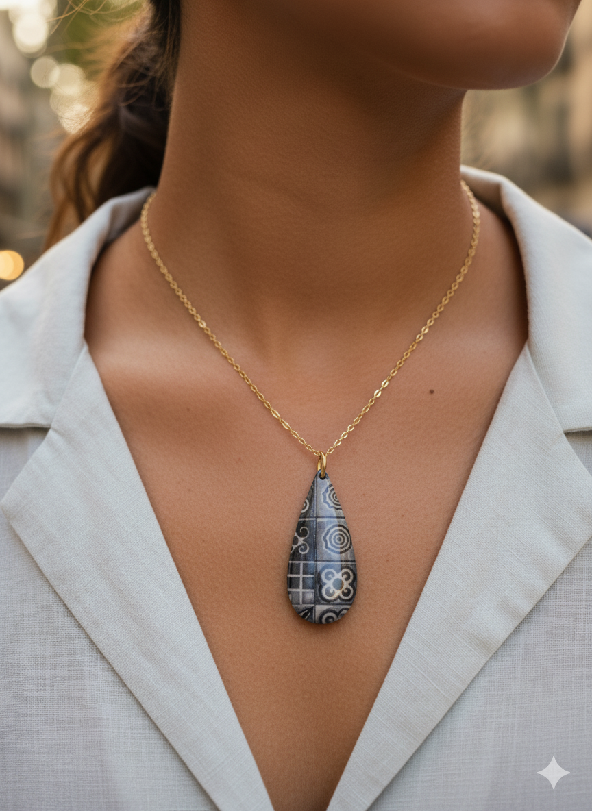 El colgante lágrima mosaico Barcelona combina la delicadeza de la arcilla polimérica con la resistencia de la resina y el acero inoxidable, ofreciendo una pieza única y duradera. Su diseño inspirado en los mosaicos tradicionales de Barcelona aporta un toque artístico y sofisticado, ideal para quienes buscan un accesorio elegante que refleje cultura y estilo contemporáneo. Perfecto para uso diario o ocasiones especiales, garantiza comodidad y longevidad sin perder su belleza original.