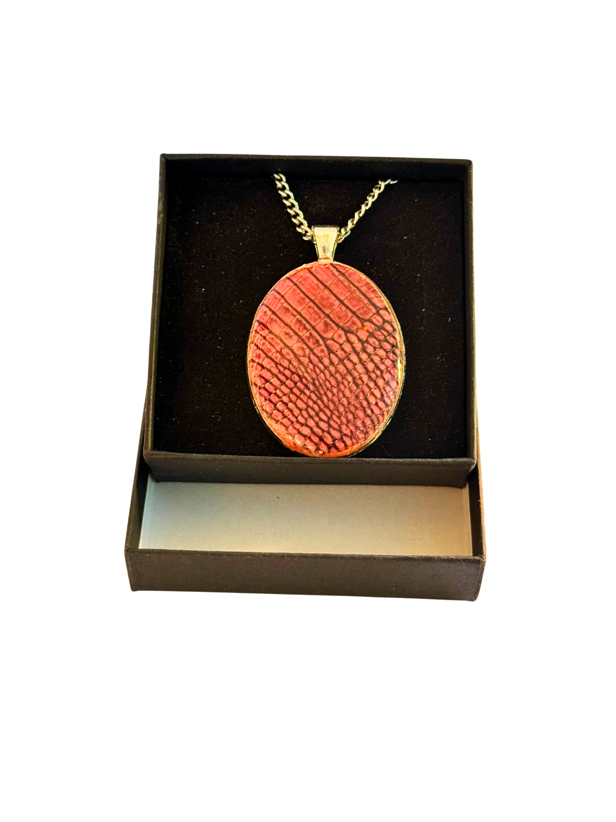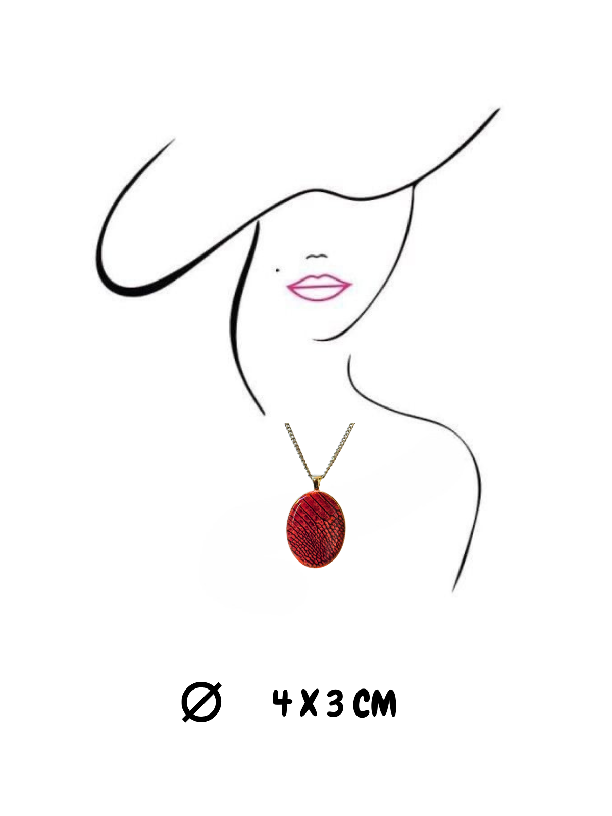 Este colgante ovalado presenta un diseño elegante inspirado en la piel de serpiente, fabricado en arcilla polimérica y resina para asegurar detalles precisos y durabilidad. El medallón está montado en una cadena de acero inoxidable, resistente al desgaste y al paso del tiempo. Ideal para quienes buscan una pieza distintiva con un toque sofisticado. Se entrega en una caja negra de joyería, perfecta para regalo o almacenamiento seguro.