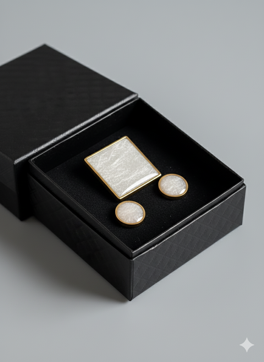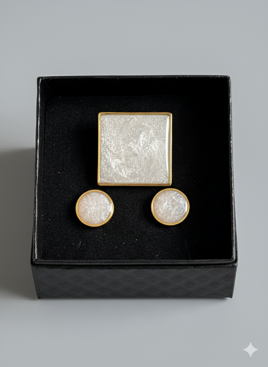 Este conjunto combina un anillo con diseño cuadrado y pendientes tipo botón, ambos con un sutil color perla que aporta elegancia y sofisticación. Su acabado delicado y discreto permite que se integren fácilmente en cualquier estilo, desde el más formal hasta el casual, realzando la apariencia con un toque refinado y contemporáneo. Perfecto para quienes buscan una joyería versátil y atemporal.