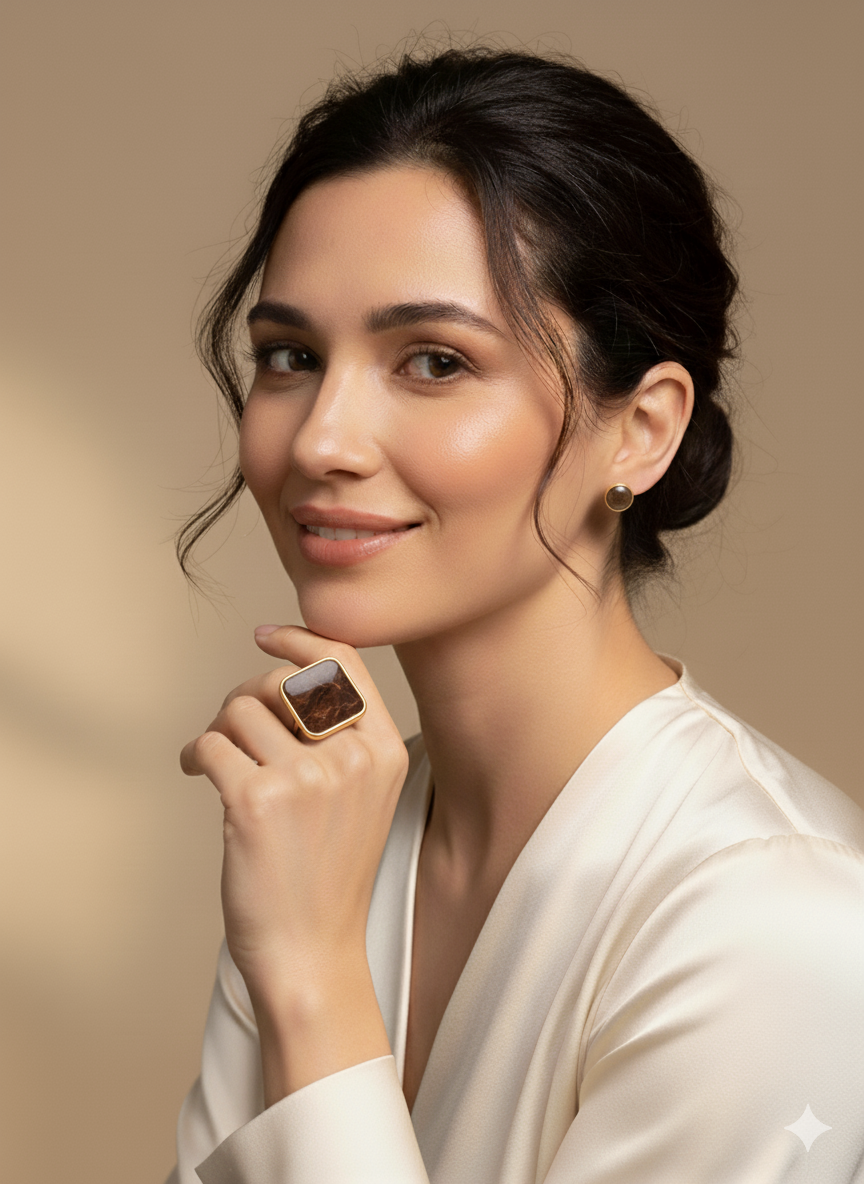 Conjunto Anillo cuadrado y pendientes marrón chocolate