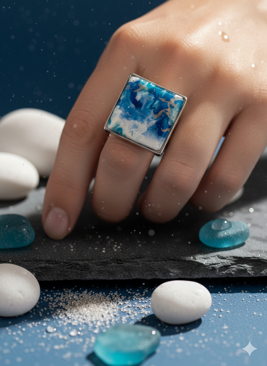 Anillo ajustable confeccionado en arcilla polimérica y resina con acabado estampado en tonos azules. La base de acero inoxidable garantiza durabilidad y resistencia a la oxidación, ideal para un uso prolongado sin deterioro. Su diseño ajustable se adapta a diferentes tallas, ofreciendo comodidad y versatilidad. Pieza artesanal que combina técnicas tradicionales con materiales contemporáneos, perfecta para complementar cualquier estilo personal.