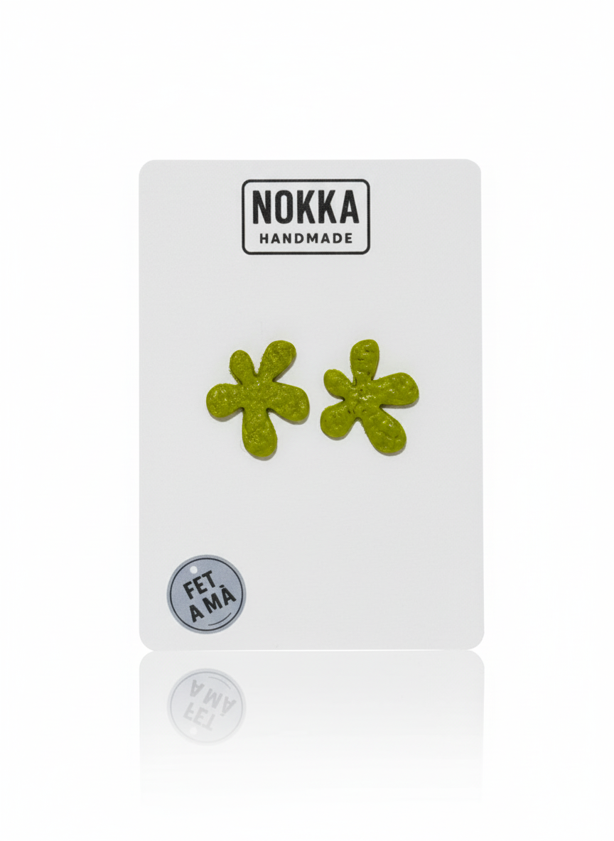 Estos pendientes botón con diseño de flor en color verde pistacho están elaborados artesanalmente en arcilla polimérica, ofreciendo un acabado delicado y duradero. Sus cierres de acero inoxidable garantizan una sujeción segura y resistencia al desgaste, ideales para un uso prolongado sin causar alergias. Perfectos para aportar un toque sutil y natural a cualquier look, combinando calidad y estilo.