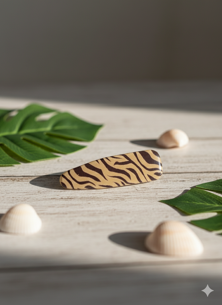 Esta pinza para el cabello con diseño animal print está confeccionada en arcilla polimérica y resina, materiales que garantizan durabilidad y un acabado elegante. Su cierre metálico asegura una sujeción firme y cómoda, ideal para mantener el cabello en su lugar con estilo y seguridad. Perfecta para quienes buscan un accesorio resistente y con un toque sofisticado.