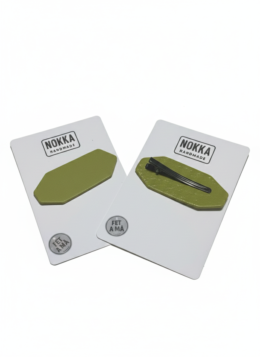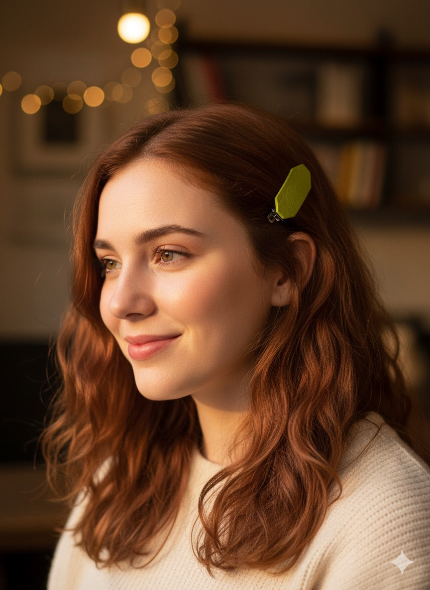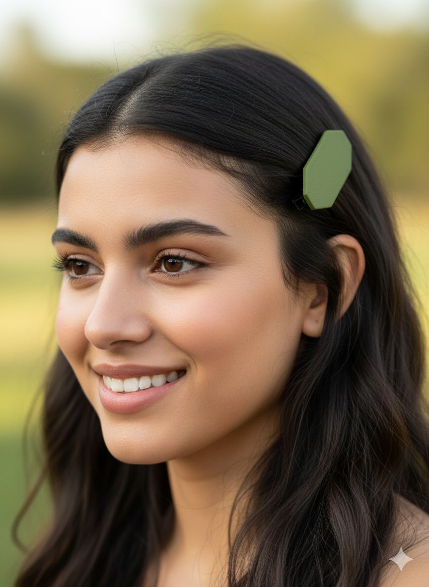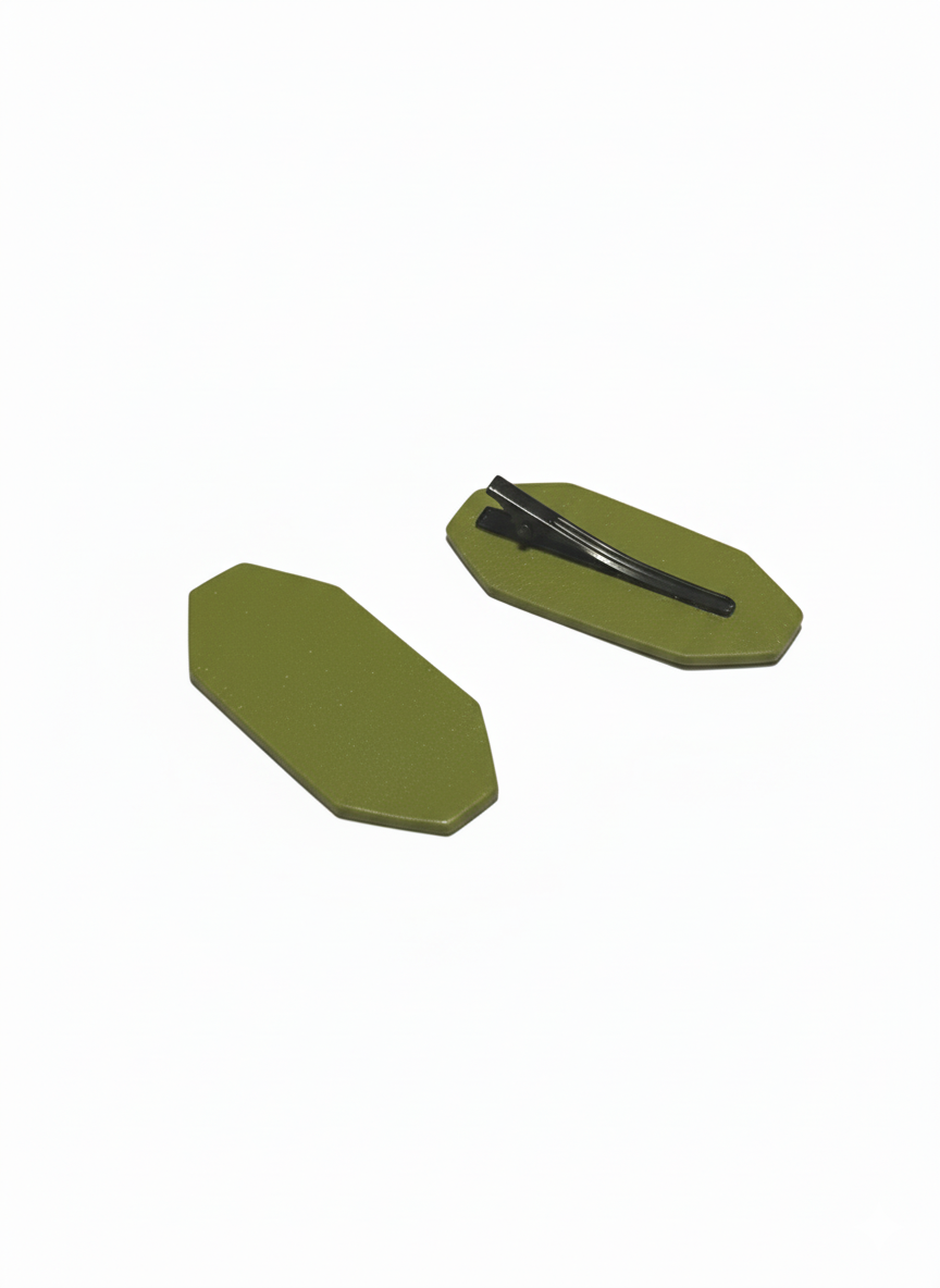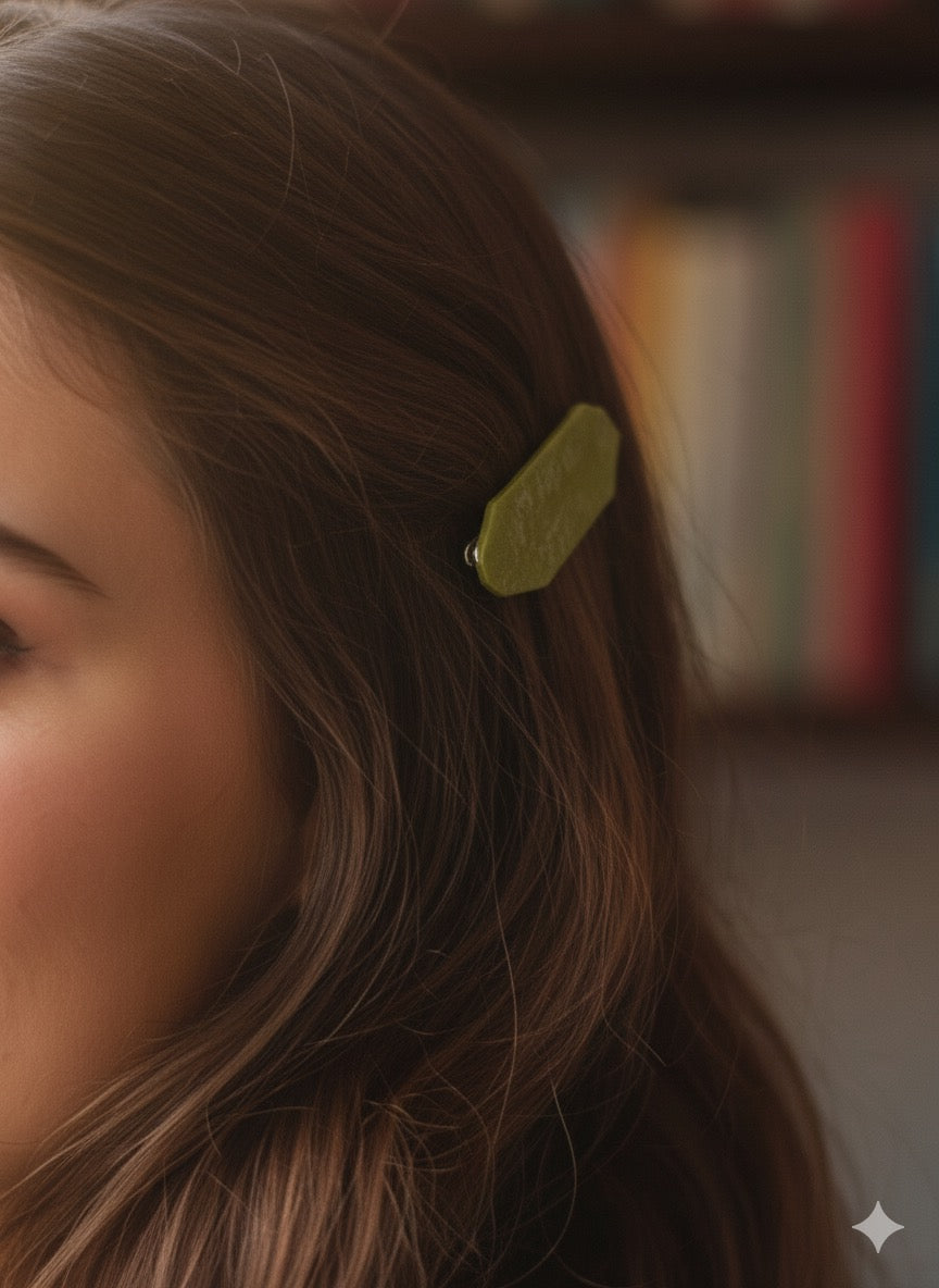 Esta pinza para el cabello en color verde, fabricada en arcilla polimérica con inspiración en texturas de piel, combina diseño innovador y resistencia. Su cierre metálico asegura un agarre firme y cómodo, ideal para mantener el cabello estilizado con un toque elegante y natural. Perfecta para quienes buscan calidad y estilo en un accesorio funcional.