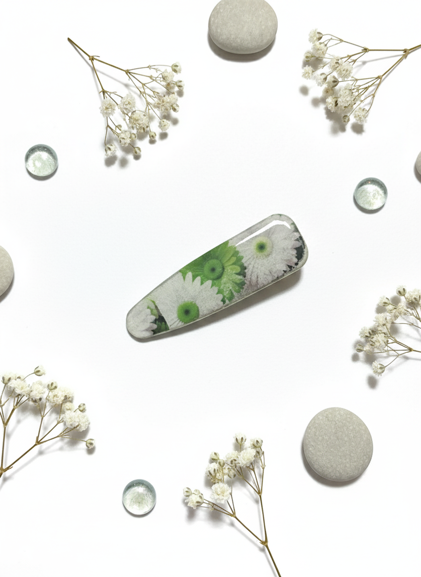 Esta pinza para el cabello combina la delicadeza de la arcilla polimérica con la resistencia de la resina, ofreciendo un diseño floral único y duradero. Su cierre metálico asegura una sujeción firme y cómoda, ideal para mantener el peinado en su lugar durante todo el día con estilo y elegancia.