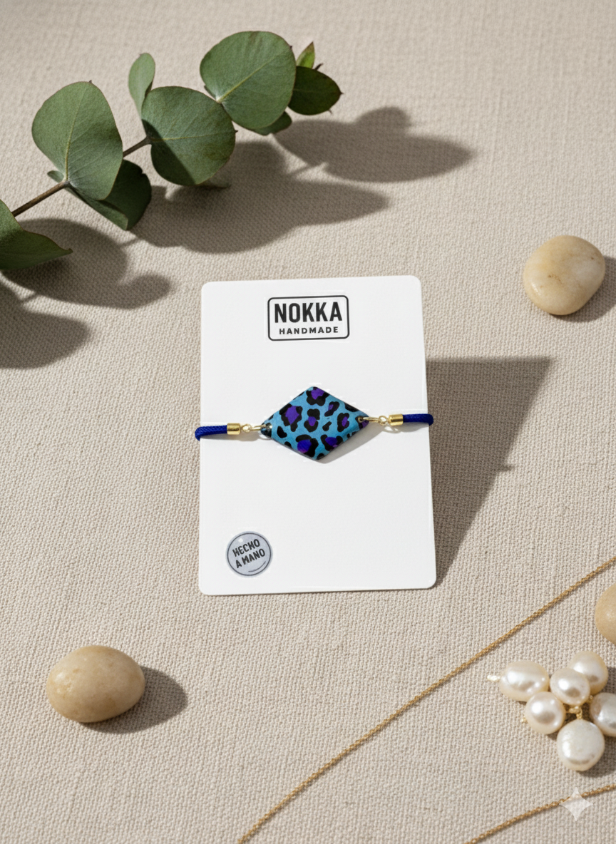 Pulsera artesanal con diseño rombo y animal print, confeccionada en arcilla polimérica de alta calidad combinada con resina resistente y detalles en acero inoxidable. Esta composición garantiza durabilidad y flexibilidad, permitiendo un uso cómodo en el día a día. El acabado pulido resalta los patrones geométricos y las texturas del animal print, creando una pieza versátil que complementa tanto looks casuales como más elaborados. El acero inoxidable previene oxidación y reacciones alérgicas, asegurando que la pulsera mantenga su aspecto impecable con el paso del tiempo.